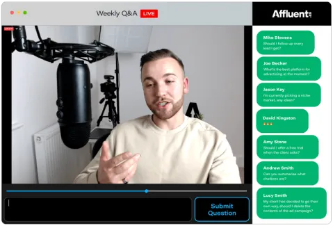 Every week we get the whole community together for live Q&A sessions available exclusively to members, giving you direct access to Jordan & the Affluent Agency's team of industry leading ad experts.